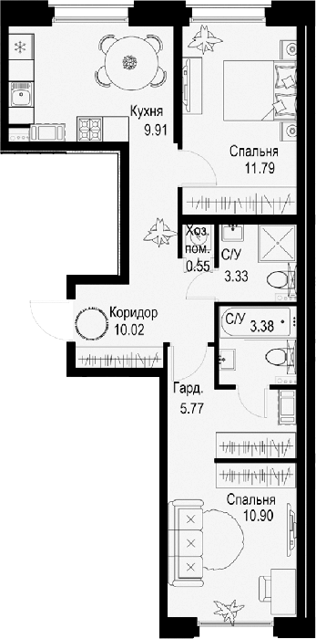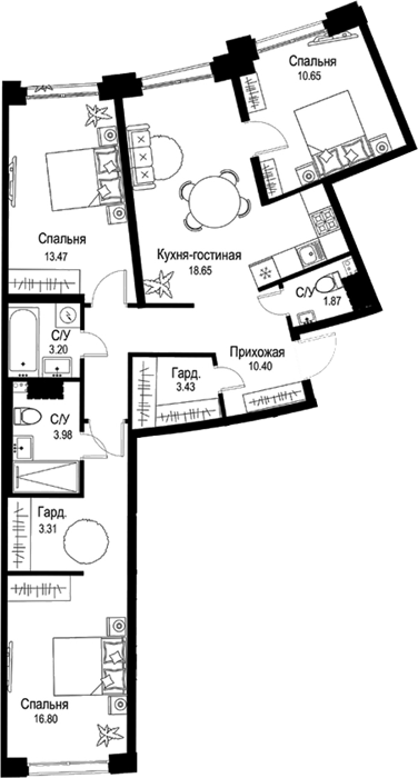 В проекте предложено множество планировочных решений: от студий до 5-комнатых квартир, как классического типа, так и европланировки. Сдаются они с высотой потолков 3 метра, панорамными окнами и без отделки. В проекте предусмотрены квартиры с просторными гостиными, местами для хранения, с террасами и французскими балконами.
