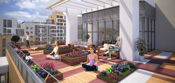 На крышах корпусов предусмотрены благоустроенные зоны отдыха и террасы для занятий йогой. На въезде в квартал предусмотрены 4 многоуровневых паркинга, во дворе расположены детские и спортивные площадки, теннисный корт и стадионы. Территория благоустроена местами для отдыха и пикника, скверами и палисадниками, велосипедными дорожками.