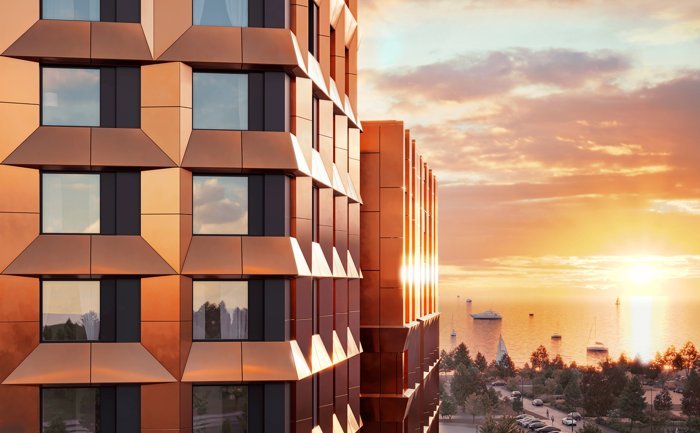 ориентация и организация в пространстве, фасадные материалы подобраны таким образом, чтобы максимально увеличить естественное освещение помещений, защитить квартиры от морского ветра и обеспечить долговечность фасада.