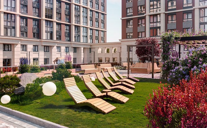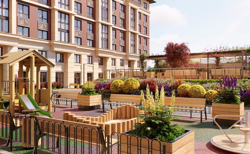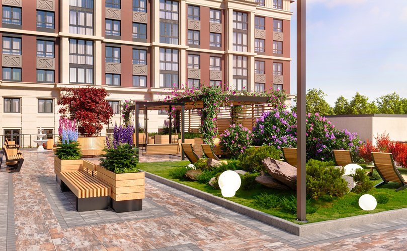 На территории предусмотрены благоустроенные дворы с детскими и спортивными площадками, зелеными зонами, уютными зонами отдыха и патио с фонтаном. Комплекс оснащен подземным отапливаемым паркингом с доступом на лифте из каждой секции.