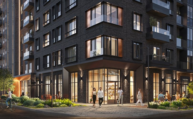 облегчает объём здания. Небольшие отступы и вариативность этажности формируют переход между городским фасадом и внутренним пространством двора.