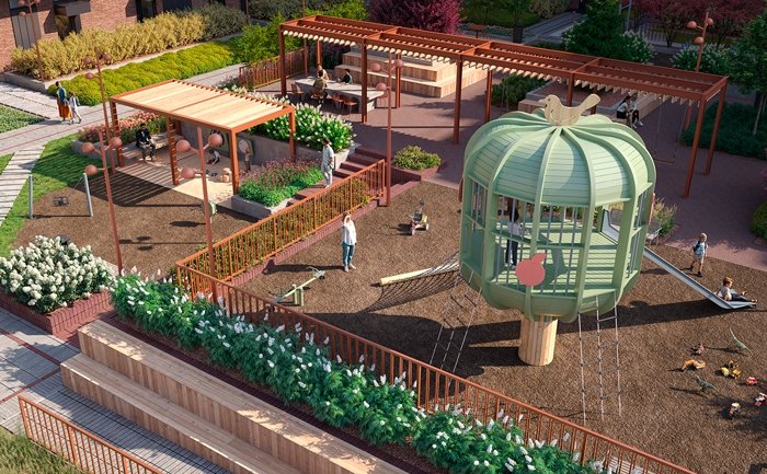 Придомовая территория комплекса благоустроена в концепции двор-холм. Выполнено озеленение, предусмотрены зоны отдыха, прогулочные дорожки, площадка для занятий йогой и детская игровая зона. В проекте запланирован многофункциональный комьюнити-центр — отдельное помещение для работы и развлечений, для отдыха и развития. На первых этажах расположены коммерческие помещения.